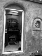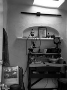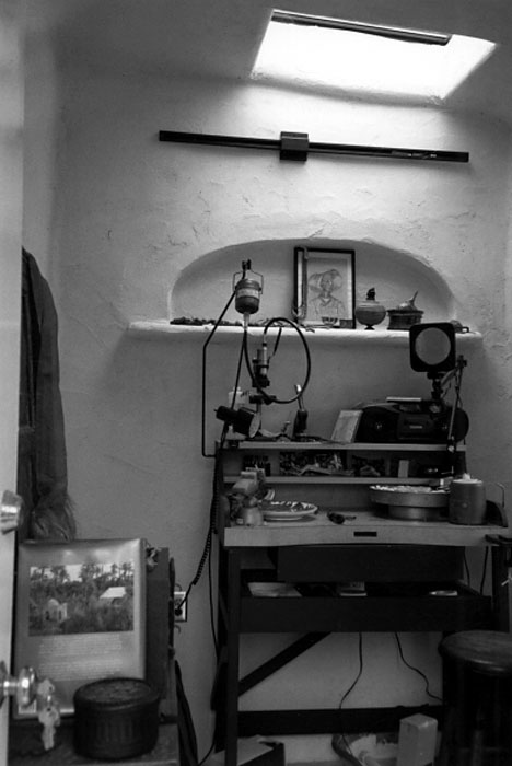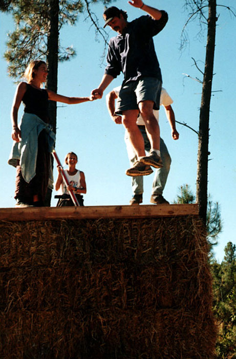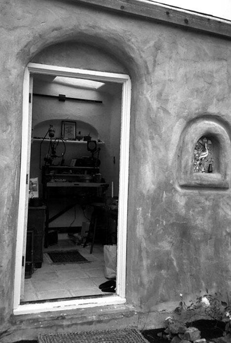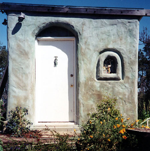 This project was built in 1996 by Boa Constructor Building and Design and a group of participants intersted in Strawbale Building organized by "Out on Bale", grass roots innovators of the Strawbale movement. It was constructed as an educational tool, more for the process than the product. A group of about 12 of us put it up in a week-end workshop with slide shows and other educational models. The finish took a bit longer, hand done by michele, debrae and friends. It is a 10 x 12 load bearing structure built this size so it wouldn't have to be permitted. Built over the properties' well as a pump house, this may have been the first Strawbale Building in Santa Cruz. Upon completion, the space was quickly utilized by debrae as a jewelry studio, but has had many incarnations since.